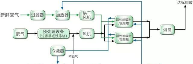 先將有機廢氣用活性炭吸附,當快達到飽和時停止吸附,然后用熱氣流將有機物從活性炭上脫附下來使活性炭再生;脫附下來的有機物已被濃縮(濃度較原來提高幾十倍)并送往催化燃燒室催化燃燒成二氧化碳及水蒸氣排出。當有機廢氣的濃度達到2000PPm以上時,有機廢氣在催化床可維持自燃,不用外加熱。燃燒后的尾氣一部分排入大氣,大部分被送往吸附床,用于活性炭再生。這樣可滿足燃燒和吸附所需的熱能,達到節能的目的。再生后的可進入下次吸附;在脫附時,凈化操作可用另一個吸附床進行,既適合于連續操作,也適合于間斷操作。